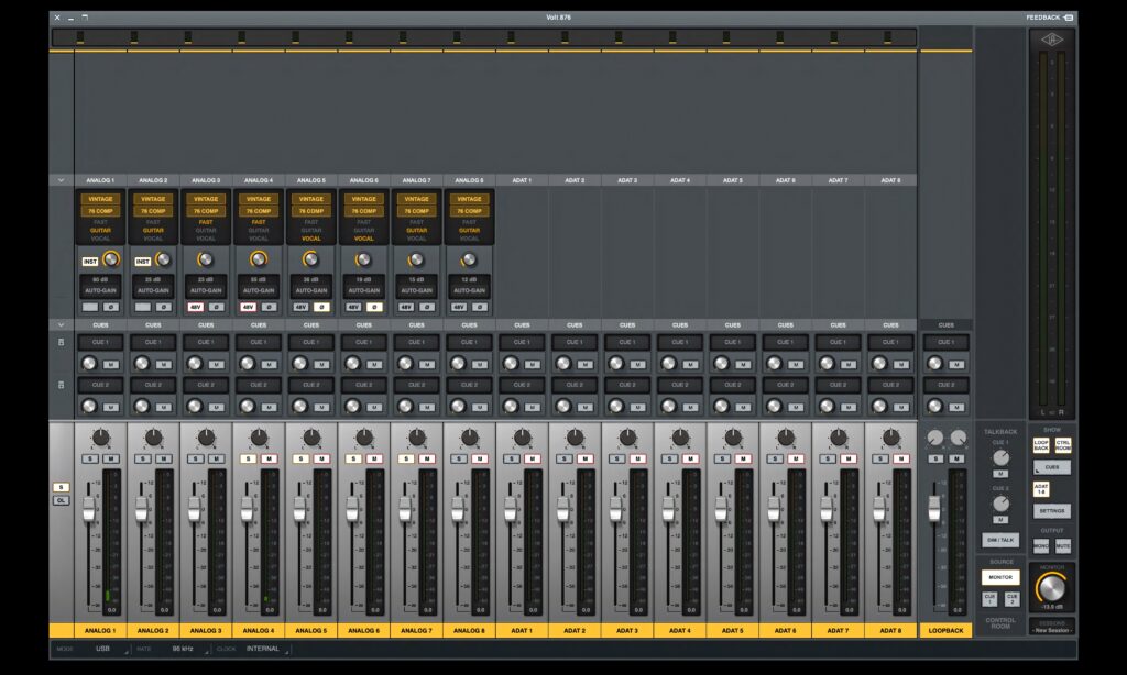 Hinzu kommt das solide Direct-Monitoring sowie die Möglichkeit, die Kopfhörer-Ausgänge mit zwei Cue-Sends aus der UAD-Console zu speisen. Bemerkenswert: ein so umfangreicher Software-Mixer war bislang nur teureren Apollo-Interfaces vorbehalten – sinnvoll vor allem, wenn, wie hier, ausreichend Ein- und Ausgänge vorhanden sind.