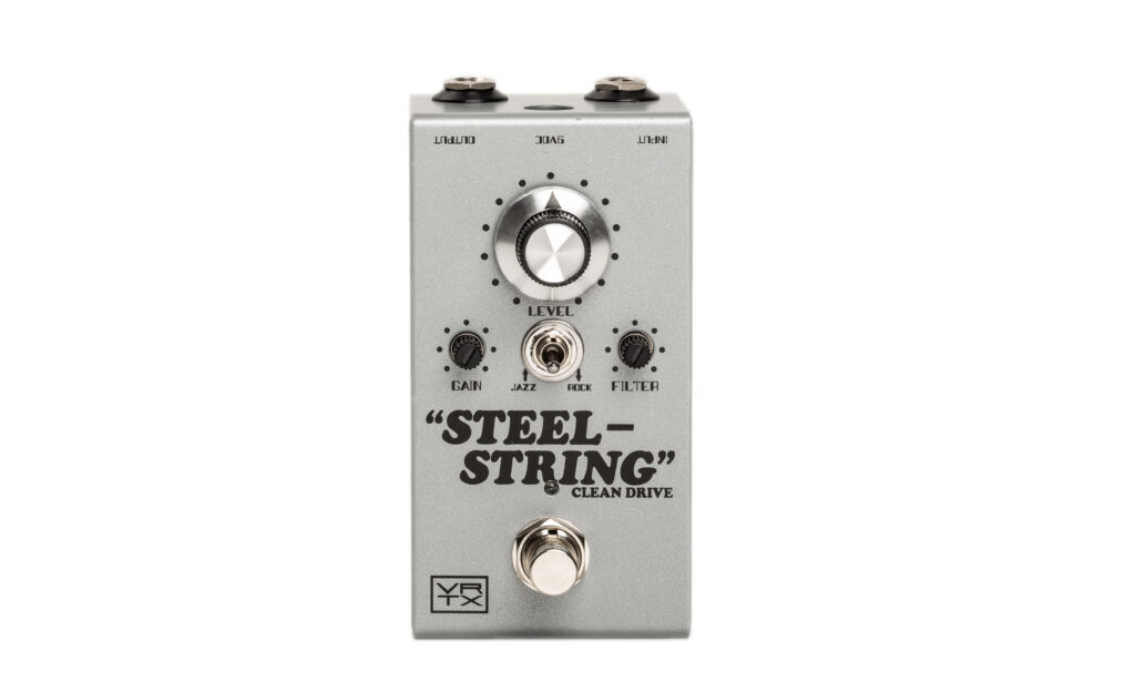 Auf der vorderen Pedalhälfte beherbergt das Steel String ein großes, mittig positioniertes Level-Poti für die Gesamtlautstärke des Effekts. Dahinter finden wir in einer Reihe von links ein Mini-Poti für Gain, einen Zweifach-Wahlschalter für EQ-Settings, ein weiteres Mini-Poti namens Filter, das die mittleren Frequenzen beeinflussen soll, und dahinter den True-Bypass-Fußschalter.