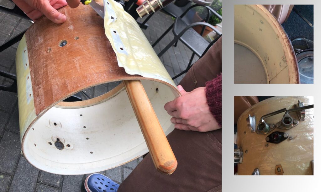 Alle Kessel sind außerdem – wie es typisch für 60er-Jahre Ludwigs ist – leicht unrund, da die Folie quasi mit in den Verstärkungsring geklebt wurde. Von den Gratungen brauchen wir gar nicht anzufangen. So wie das Set im übernommenen Zustand war, konnte Daniel es weder stimmen noch spielen.