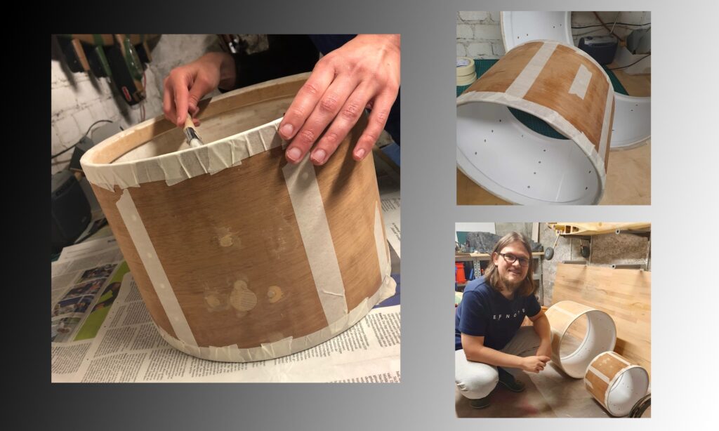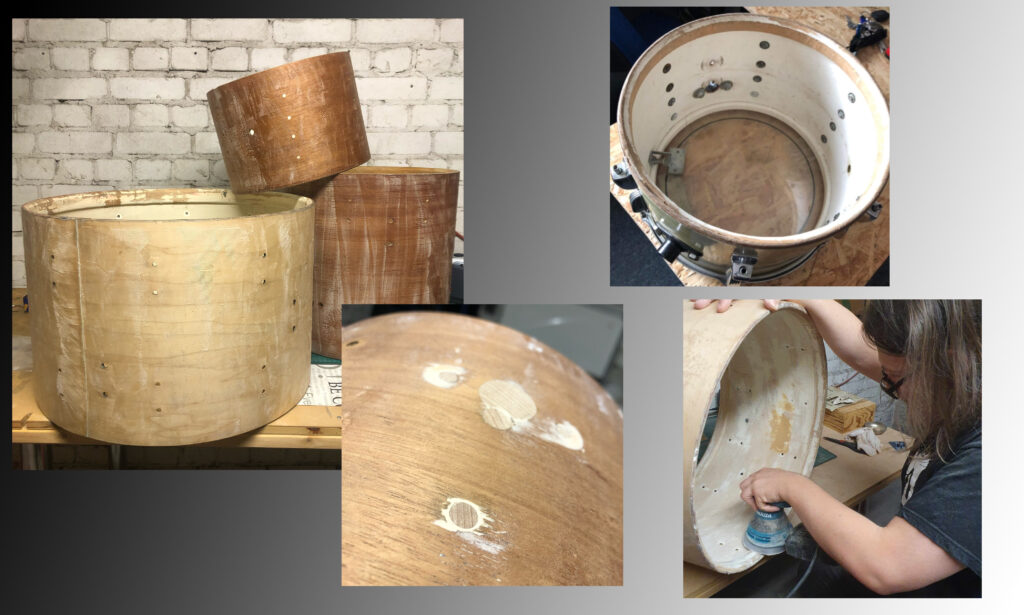 Auf den folgenden Bildern findet ihr eine Collage aus den Arbeitsschritten, die Daniel und seine Freundin Raphaela bei der Überarbeitung festgehalten haben. Kurioses Detail: alle Kessel sind 3ply-Kessel, bestehen aber aus unterschiedlichen Hölzern. Mahagoni-Pappel-Mahagoni, Ahorn-Pappel-Ahorn und Mahagoni-Pappel-Ahorn – was beweist, dass einfach die Hölzer verbaut wurden, die damals in der Fabrik zur Verfügung standen. Unschön aussehende Innenlagen wurden mit weißer Farbe übertüncht.