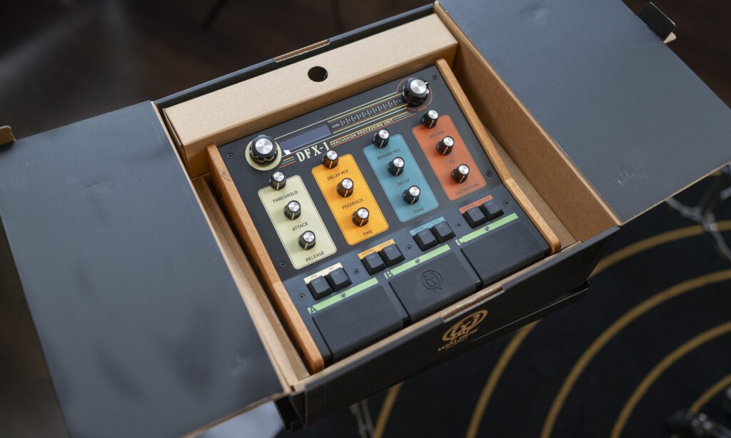 Der erste Eindruck entsteht immer beim Auspacken, und er ist positiv. In Zeiten, in denen Features und Funktionen eine große Rolle spielen, leidet oft die Verarbeitungsqualität. Nicht so beim DFX-1. Das Teil wirkt mit seinen Echtholzwangen und den Farben im Retrolook nicht nur sehr ansprechend, es ist auch robust und sauber verarbeitet. In der hübschen Schachtel finde ich ein externes Netzteil mit Adaptern, eine kurze Beschreibung des Geräts und – ein Plektrum! Sehen wir uns jetzt mal die Funktionen und Bedienelemente an.