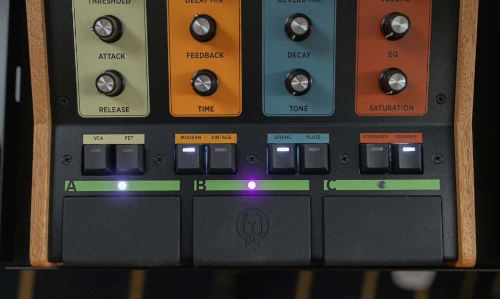 Außerdem lässt sich die Abfolge der Effekte festlegen. Forward bedeutet, dass zuerst der Kompressor, dann das Delay und am Ende Reverb kommt, Reverse dreht den Ablauf um. Damit lassen sich Hallräume nochmal besonders „aufblasen“. Im Menü kann die Abfolge komplett frei angepasst werden, auch das Einfügen externer Effektpedale und ihre Position in der Signalkette wird hier gemanagt.