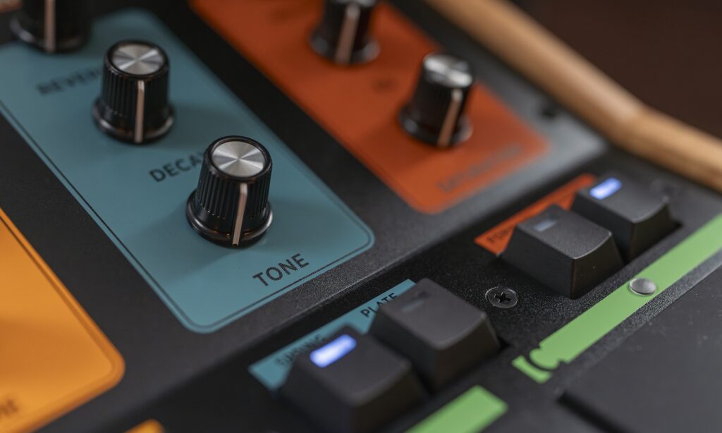 Die blaue Reverb (Hall)-Abteilung beinhaltet die Länge des Halls (Decay), den Klang (Tone, eher dumpf oder eher hell) und wiederum die Lautstärke des Effekts (Mix). Plate und Spring, also Platten- und Federhall, stehen als Halltypen zur Verfügung. Zuletzt findet sich im ganz rechten Abschnitt der globale Lautstärkeregler, eine Art Tilt-EQ für einen eher bass- oder höhenbetonteren Charakter sowie ein Regler mit der Aufschrift „Saturation“. Hier kann der virtuelle Eindruck typischer Sättigungsartefakte analoger Schaltkreise hinzugefügt werden.