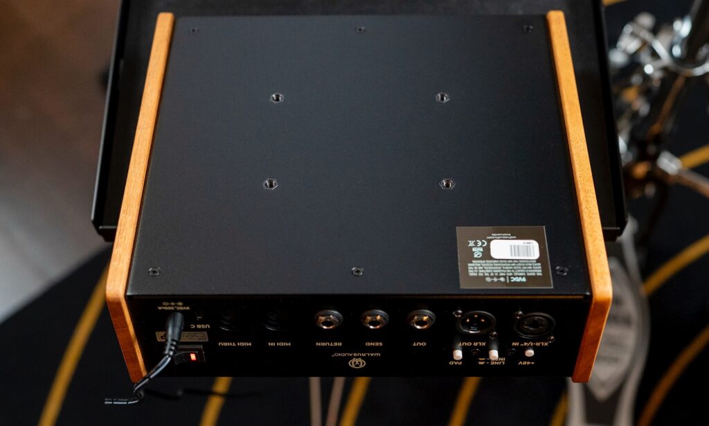 Auf der Rückseite zeigt sich, dass das DFX-1 sowohl für alle Mikrofontypen als auch Line/Instrument-Level-Signale vorbereitet ist. Links liegt eine XLR-Kombibuchse, ein Taster für Phantomspeisung (für Kondensatormikrofone) und sogar eine Pegelabsenkung ist vorhanden. 60 dB Gain stellt der Preamp bereit, die interne Samplerate des Wandlers beträgt 44,1 kHz bei 24bit fixed. Der Rauschabstand des symmetrischen Eingangs liegt bei 99 dB. Dies sind alles keine Topwerte im Vergleich zu hochwertigen Interfaces, darum geht es hier aber eben auch nicht primär. Interessanter sind die 2,9 Millisekunden Latenz, denn die fallen tatsächlich praktisch nicht ins Gewicht.