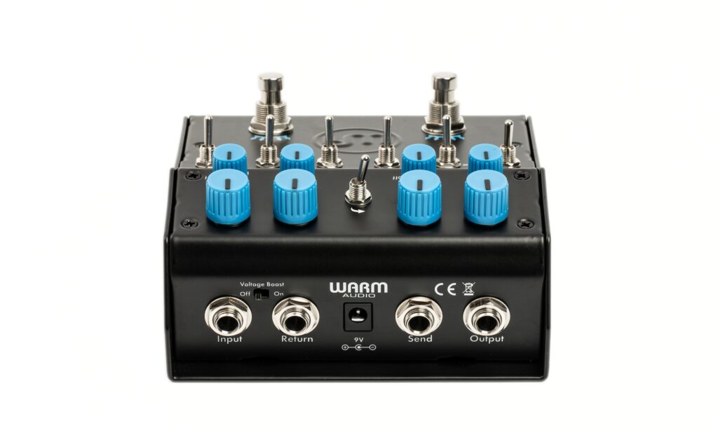 An der Stirnseite des Gehäuses finden sich die Ein- und Ausgänge (Input/Output), ein Einschleifweg zwischen den Pedalhälften (Send/Return) und der Anschluss für ein Standard-9-V-Netzteil (mind. 24 mA). Bei Bedarf kann hier außerdem die interne Spannungsversorgung des Throne Of Tone auf 18 V erhöht werden (Voltage Boost).