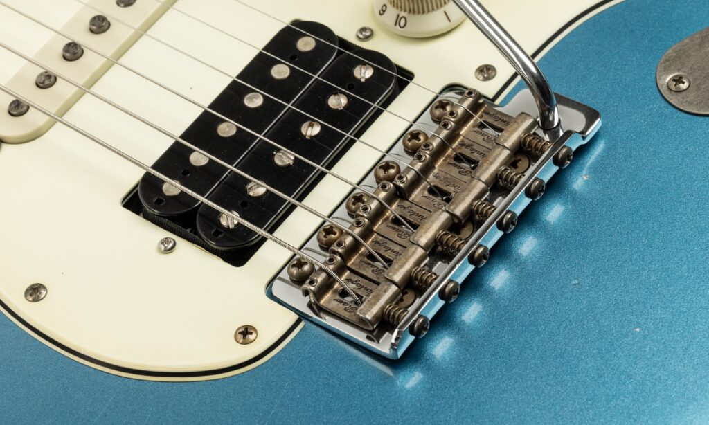 Die Xotic XSC-2 MN kommt als traditionelle Superstrat-Variante mit einer HSS-Bestückung. Der Korpus besteht aus Erle, wobei der für das Finish verwendete Nitro-Lack einem „Heavy Aging“ unterzogen wurde. Unsere Testkandidatin erstrahlt in Lake Placid Blue, grundsätzlich bietet Xotic aber eine immense Fülle an Farboptionen an. Hinsichtlich der Verarbeitung gibt es nur Positives zu vermelden, denn das Instrument wirkt extrem edel und hochwertig, wobei das Gewicht mit sehr rückenschonenden 3,37 kg zu Buche schlägt. Der geschraubte und optisch äußerst attraktive Hals ist aus geröstetem und geflammtem Master-Grade-Ahorn gefertigt. Das geleimte Ahorngriffbrett ist mit 22 Medium-Jumbo-Bünden bestückt bei einem Griffbrettradius von 9,5“. Die Mensur hat die vertrauten Strat-Maße von 648 mm (25,51“), der Sattel ist 43 mm breit.